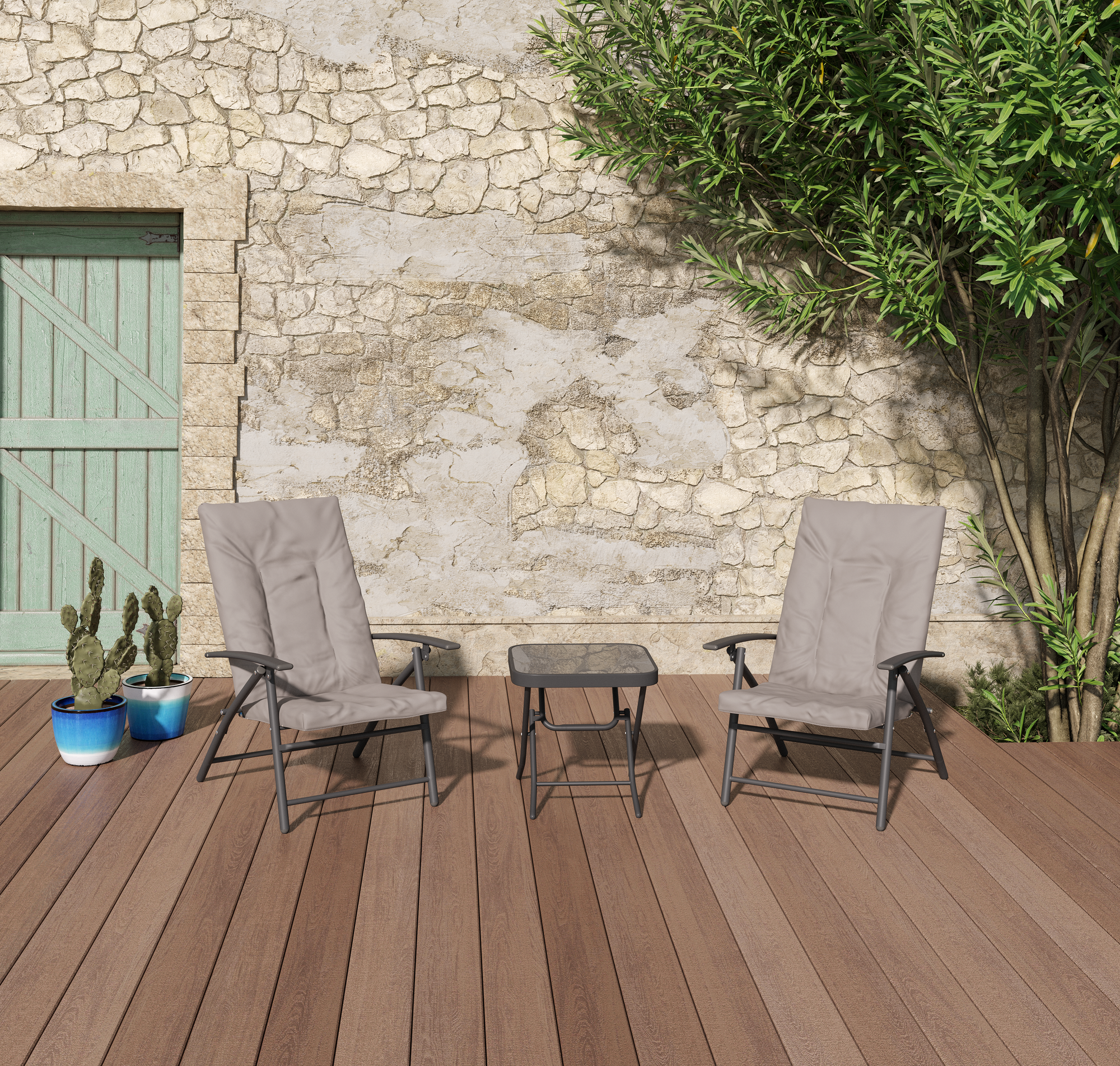Structure en acier, assise en polyester rembourré, plateau en verre trempé 5mm. Comprend :