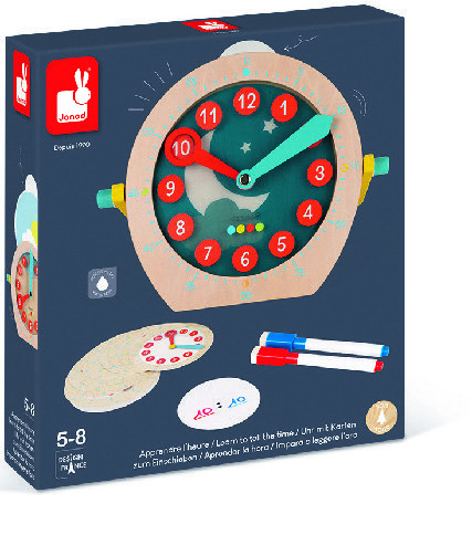 Ce jouet dâéveil en bois est idéal pour apprendre lâheure tout en sâamusant ! Comprend : des cartes modèles à reproduire, une carte vierge, deux feutres effaçables et 6 fiches à insérer dans lâhorloge.