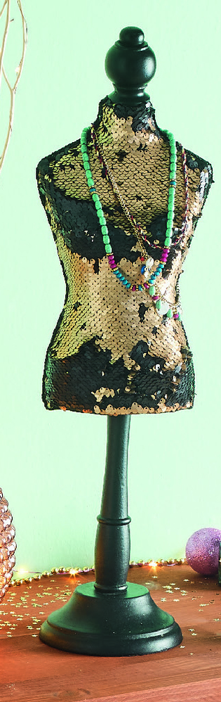 Exposez vos bijoux avec style grâce au porte bijoux mannequin en bois et paillettes. Ce modèle, mesurant 57,5 cm de hauteur, mettra en valeur vos précieux accessoires. Idéal pour organiser et mettre en scène vos colliers, bracelets et boucles d'oreilles. Apportez une touche de glamour à votre décoration intérieure avec ce superbe porte bijoux mannequin. Accessoires non inclus.