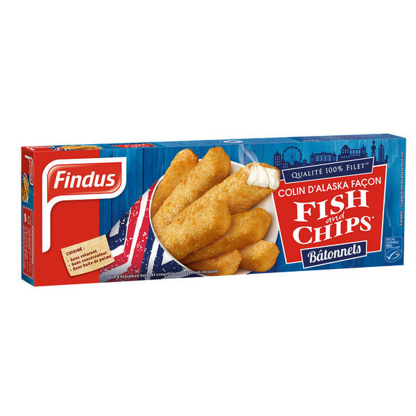 Poisson pané bâtonnets colin alaska façon fish & chips msc Findus la boite de 364 g. 13 portions composées de morceaux de filets de Colin d'Alaska (Theragra chalcogramma) pêché en océan Pacifique Nord, enrobées d'une pâte à beignet, préfrites, surgelées. Ingrédients: Colin d'Alaska 48,9%, panure 37,7% [farine d blé 20,9%, eau, amidons (pomme de terre, blé), sel, semoule et farine de maïs, poudre à lever ALITE (diphosphates, bicarbonate de sodium), levure, moutarde, lait écrémé en poudre, ail en poudre,huile de colza 13,4%. Préparé en Allemagne. SANS ete 3)Bien qu'un soin tout particulier ait été pris pour enlever toutes les arête quelques-unes peuvent exceptionnellement še trouver dans ce produit.