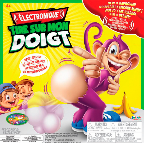 Découvre le jeu tire sur mon doigt. Fais tourner la roulette afin de savoir combien de fois tu dois tirer sur le doigt du singe pour faire gonfler ses fesses et vois si ton coup le fait péter ou non. - Offre valable du 22/10/2024 au 08/12/2024.