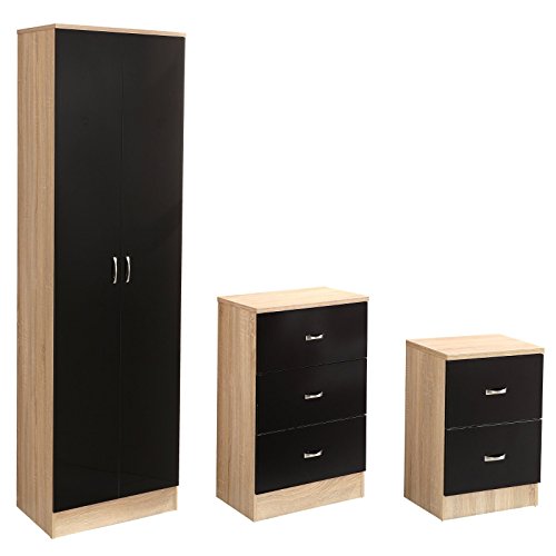 Bellissimo Lot de 3 meubles pour chambre en chêne Noir brillant 3 pièces Armoire, commode et table de chevet, Black Gloss & Oak, Trio Set ? Avant d'effectuer votre achat, Zounko