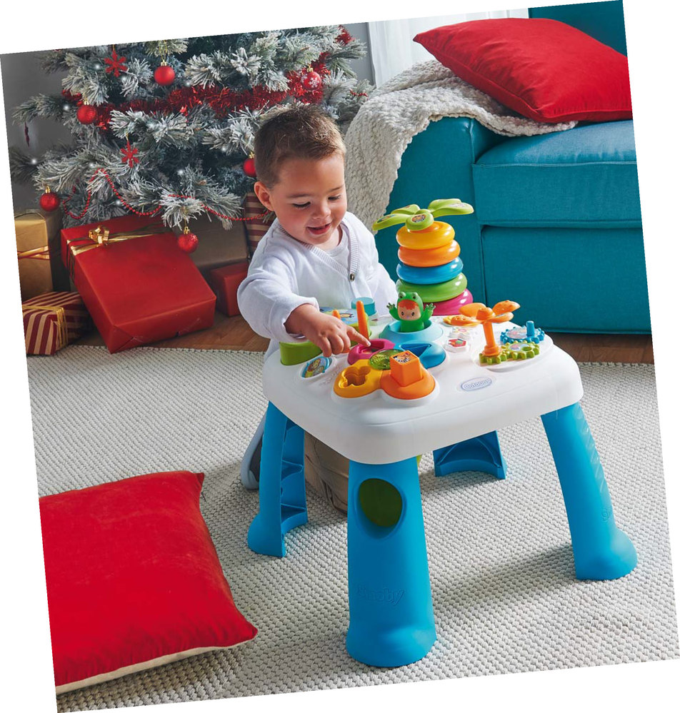 Avec des fonctions électroniques et mécaniques pour amuser bébé en développant son agilité : trieur de formes, pyramide, tambour... Effets sonores et lumineux. Existe en version rose.