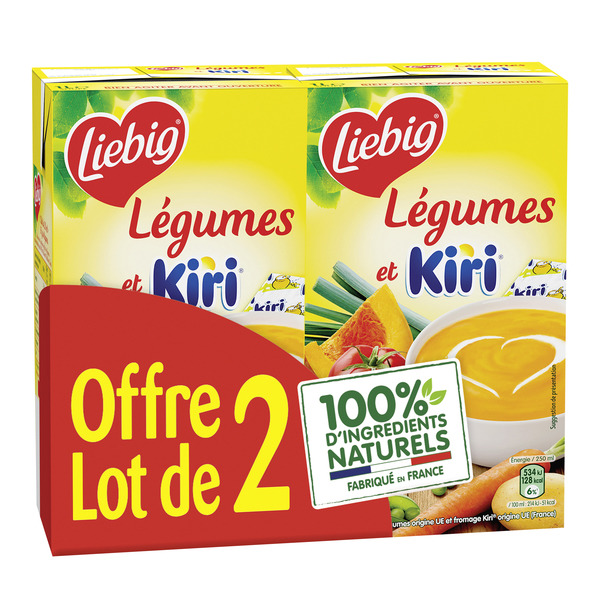 Légumes et Kiri, Potiron et Kiri, Velouté cèpes et bolets, Mouliné de légumes Bio ou Mouliné de légumes verts Bio, 2 x 1 L..