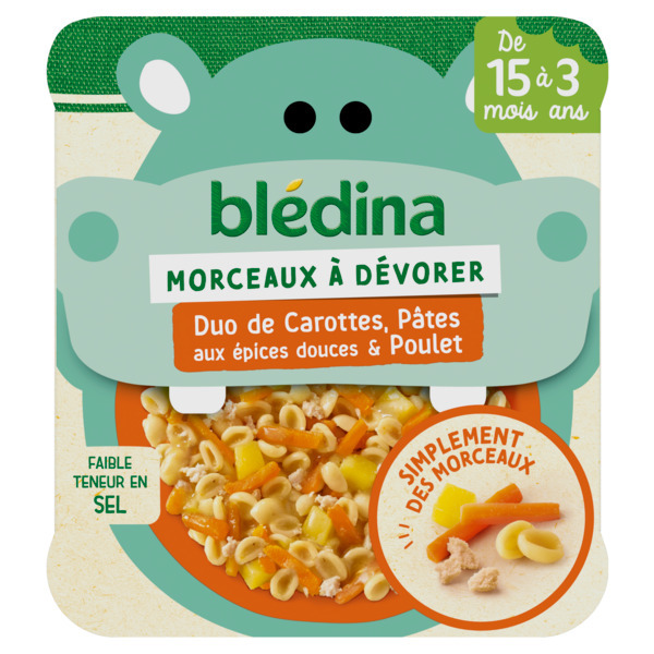 Acheter BLÉDINA MORCEAUX À DÉVORER DUO CAROTTES, PÂTES ÉPICES ET POULET
