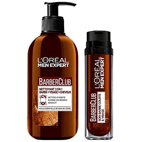 3054089432631 Coffret composé de 2 produits Barber Club pour une routine complète visage et barbe : 1x Soin Barbe Courte et 1x Nettoyant Gel 3-en-1 pour barbe, visage et cheveux,Résultats : Pour la barbe : élimine les impuretés et les résidus, adoucit la barbe. Pour le visage : purifie et hydrate la peau en douceur, Pour les cheveux : nettoie & démêle tout en respectant le cuir chevelu,Application : Gel-nettoyant : Appliquez sur la barbe, le visage et les cheveux après les avoir préalablement mouillés. Massez soigneusement en évitant le contour des yeux puis rincez. Soin : Utiliser sur l'ensemble du visage et de la barbe puis masser lentement pour une meilleure pénétration, en évitant le contour des yeux,Routine enrichie en huile essentielle de bois de cèdre connue pour ses propriétés embaumantes, Parfum frais et boisé pour une senteur masculine discrète,Contenu : 1x Coffret composé de 2 Produits Routine barbe courte Barber Club L'Oréal Men Expert, Inclus : 1x Soin Barbe Courte, 1x Gel Nettoyant 3-en-1