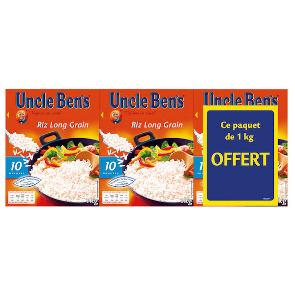 Profitez de l'offre spéciale sur le riz long grain Uncle Ben's ! Obtenez 3 kg de ce délicieux riz pour le prix de 2 boîtes de 1 kg. Ne manquez pas cette occasion, valide du 13/05/2019 au 27/05/2019. Un choix parfait pour vos repas en famille..