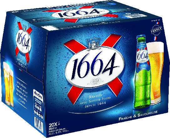 Goûtez à la bière blonde 1664, au taux d'alcool de 5,5%, en format 20x25cl, équivalant à 5 litres. Un incontournable avec son goût raffiné. Disponible maintenant !