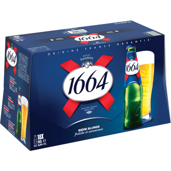 "J'adore la bière blonde 1664 18x25cl! Son goût rafraîchissant et subtil en fait ma boisson préférée pour toutes occasions. Je recommande vivement cette délicieuse bière à tous les amateurs de bonnes boissons!"