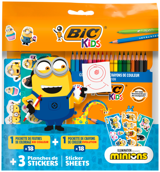 Ce kit comprend 18 feutres de coloriage et 18 crayons de couleur BIC Kids ainsi que 3 planches d’autocollants sur le thème des Minions. - Offre valable du 18/02/2025 au 02/03/2025.