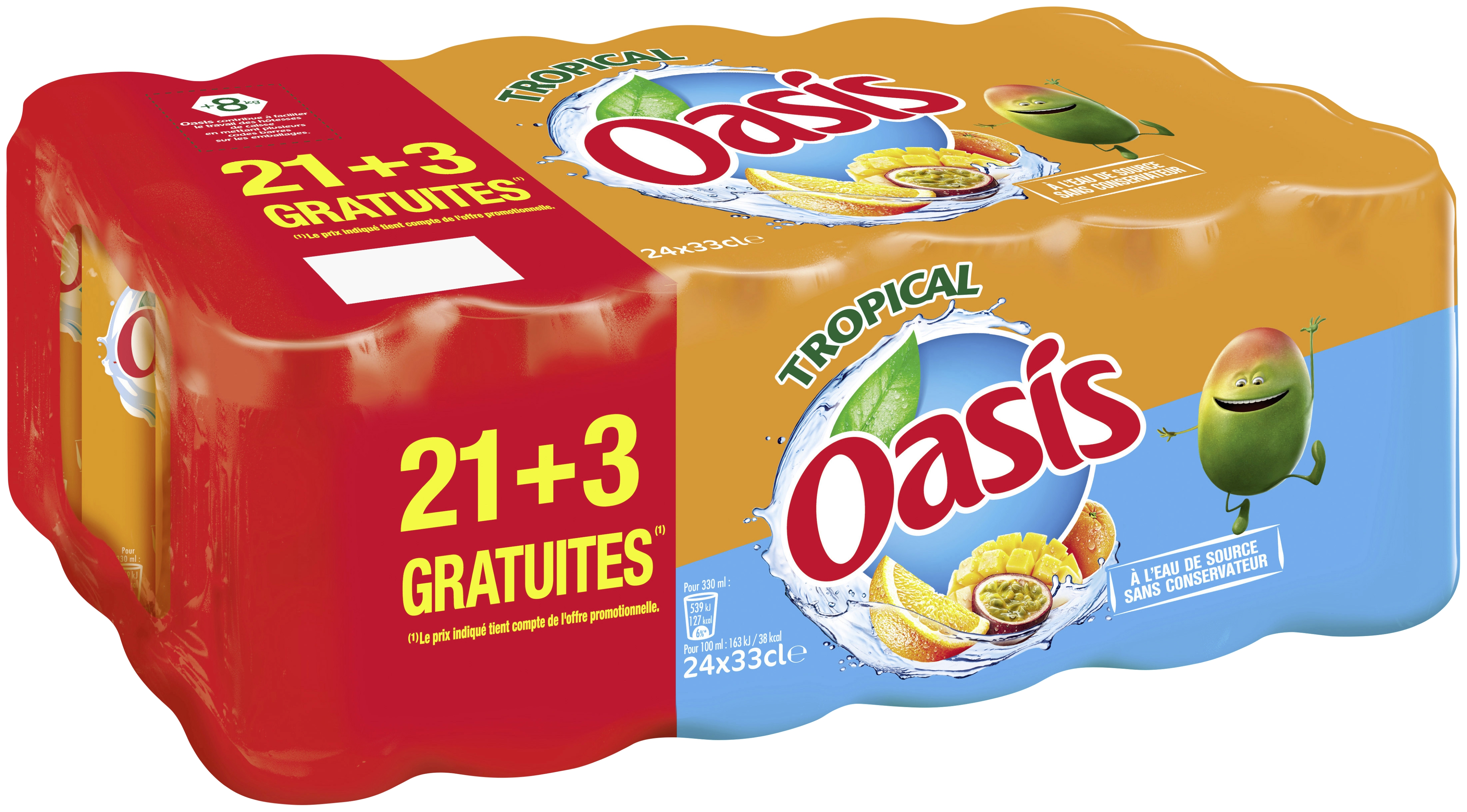 Rafraîchissez-vous avec Oasis, Oasis - Boisson aux fruits tropical, Orangina standard et Schweppes agrum' ! Profitez de l'offre de 21 x 33 cl + 3 canettes gratuites, soit 7,92 l, au prix de 1,19 € le litre. Oasis vous offre une explosion de saveurs fruitées dans chaque gorgée..