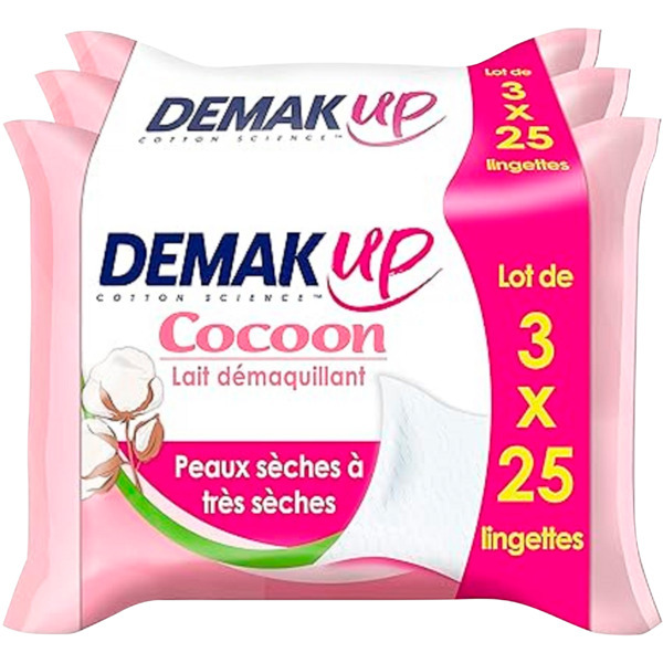Choisissez les lingettes démaquillantes Demak'up, adaptées à votre type de peau : sèche, sensible, normale ou mixte. Le lait cocoon nourrit et apaise les peaux sèches et sensibles. L'eau démaquillante convient également aux peaux sèches, sensibles, normales ou mixtes. Profitez de cet ensemble pratique de 2 x 25 lingettes pour une peau fraîche et propre tous les jours.