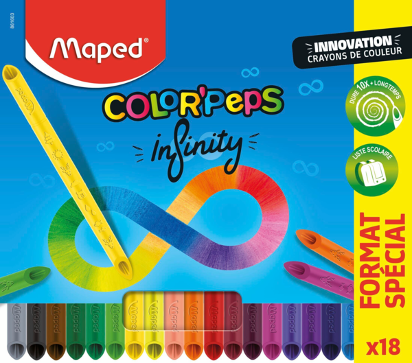 MAPED , identifié par le code barre EAN 3154148616030. Acheter MAPED 18 CRAYONS COLORPEPS INFINITY