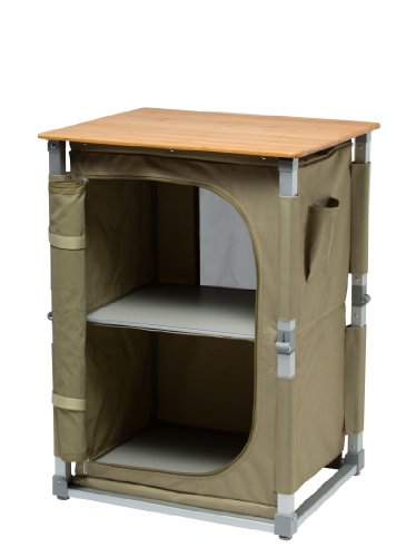 Meuble garde manger avec tablette en bambou et étagère intérieur cerclées d'aluminium. Totalement pliable donc transport et stockage facile . Fourni avec une housse de transport..
