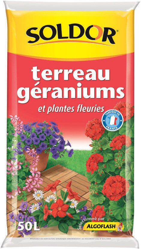 Avec engrais pour tous types de géraniums et plantes fleuries. Utilisable en Agriculture Biologique. Le sac de 50 L. Soit le litre au prix de 0,09 €..