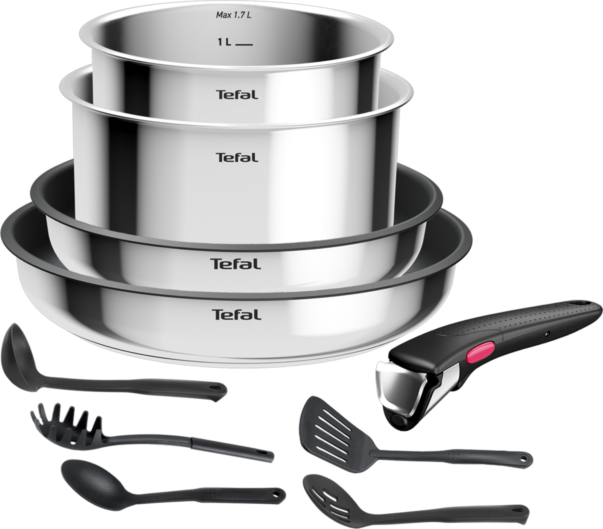 En inox.10 pièces. Comprend: poêles revêtues 22/26cm, casseroles 16/18cm, poignée, 5 ustensiles. Tous feux dont induction.. Achetez les produits TEFAL moins cher en ligne.