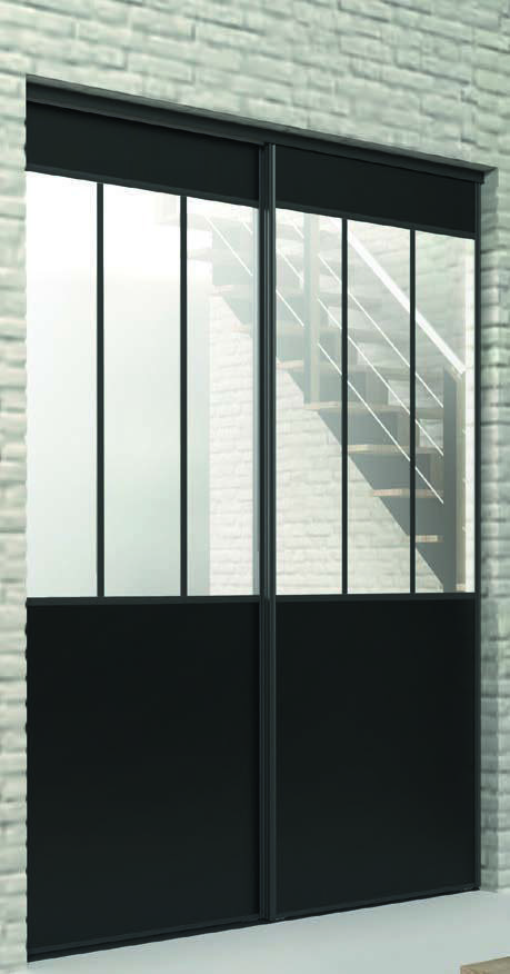 Dim. : 250 x 180 cm x ép. 10 mm. Pack Premium de deux vantaux partitionnés miroirs coloris noir industriel avec profils larges, roulettes à billes et guides. Recoupable en hauteur..