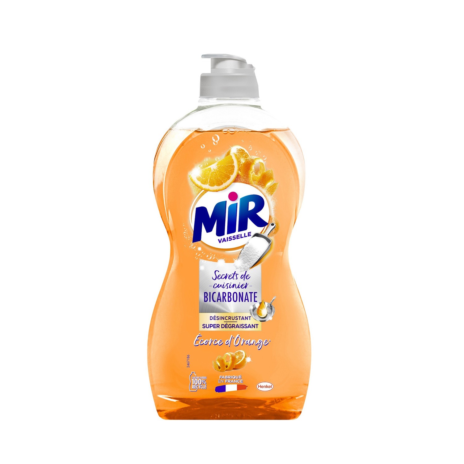 Mir Vaisselle Secrets de Cuisinier – Liquide Vaisselle – Bicarbonate & Ecorce d'orange – 500mL. Ce liquide vaisselle assure une efficacité maximum grâce au pouvoir du bicarbonate : super désincrustant.