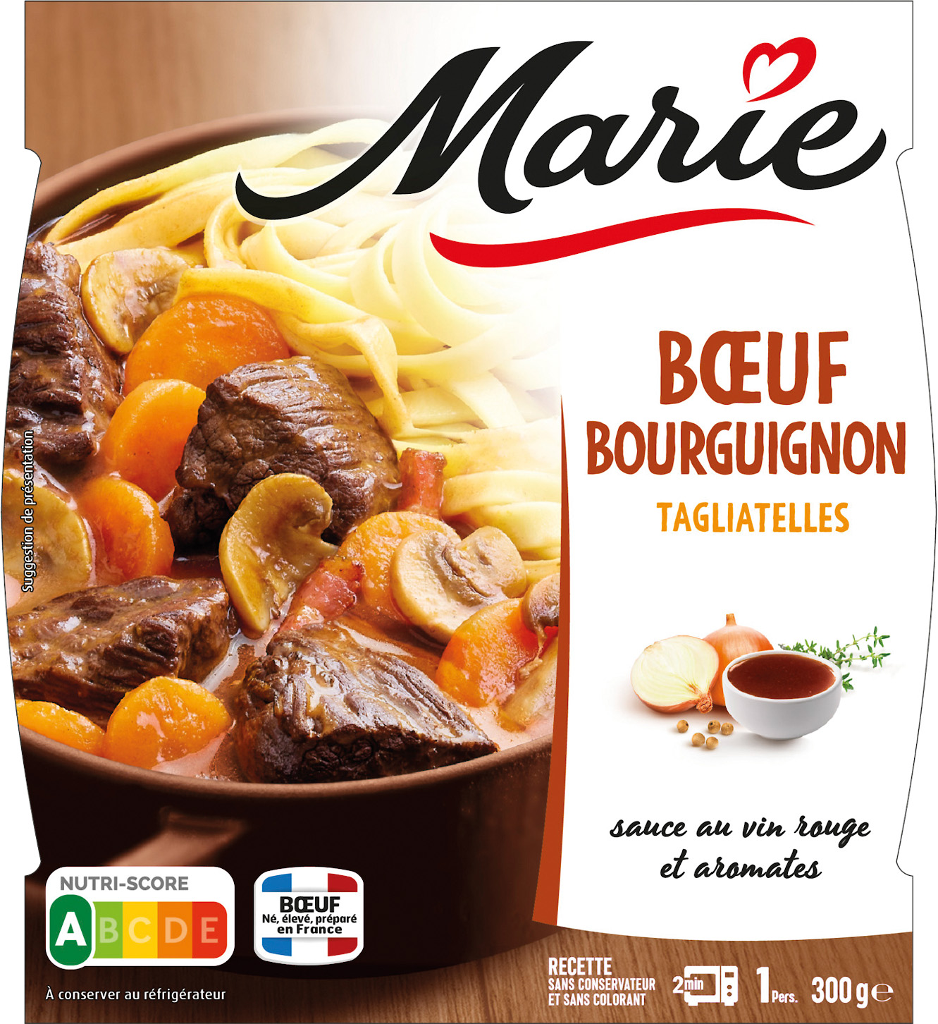 PLAT CUISINE MARIE Boeuf bourguignon tagliatelles ou émincés de poulet purée petits pois