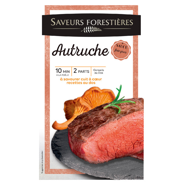 La barquette de 340 g. ÉLABORÉ EN FRANCE AU RAYON BOUCHERIE LIBRE-SERVICE - Existe aussi en pavé d'autruche sauce truffe 340 g ou pavés d’autruche saveur 3 poivres 250 g ou pavé d'autruche saveur café épices 250 g à des prix différents