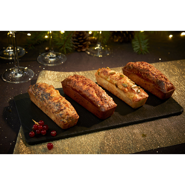 Composé d'un mini cake foie gras de canard, figue et Monbazillac, un mini cake Saint Jacques à la bretonne, un mini cake fromage de chèvre et figue et un mini cake saumon fumé et fromage frais.