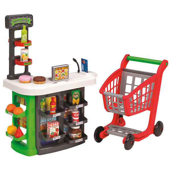 Une sortie de caisse de supermarché avec plein d'accessoires : scanner à gencod, balance pour fruits et légumes, micro, terminal CB et de quoi remplir le chariot inclus avec les fruits, les donuts, les boissons etc… Un produit vraiment complet. Dim. : L 48 x P 26 x H 72 cm.