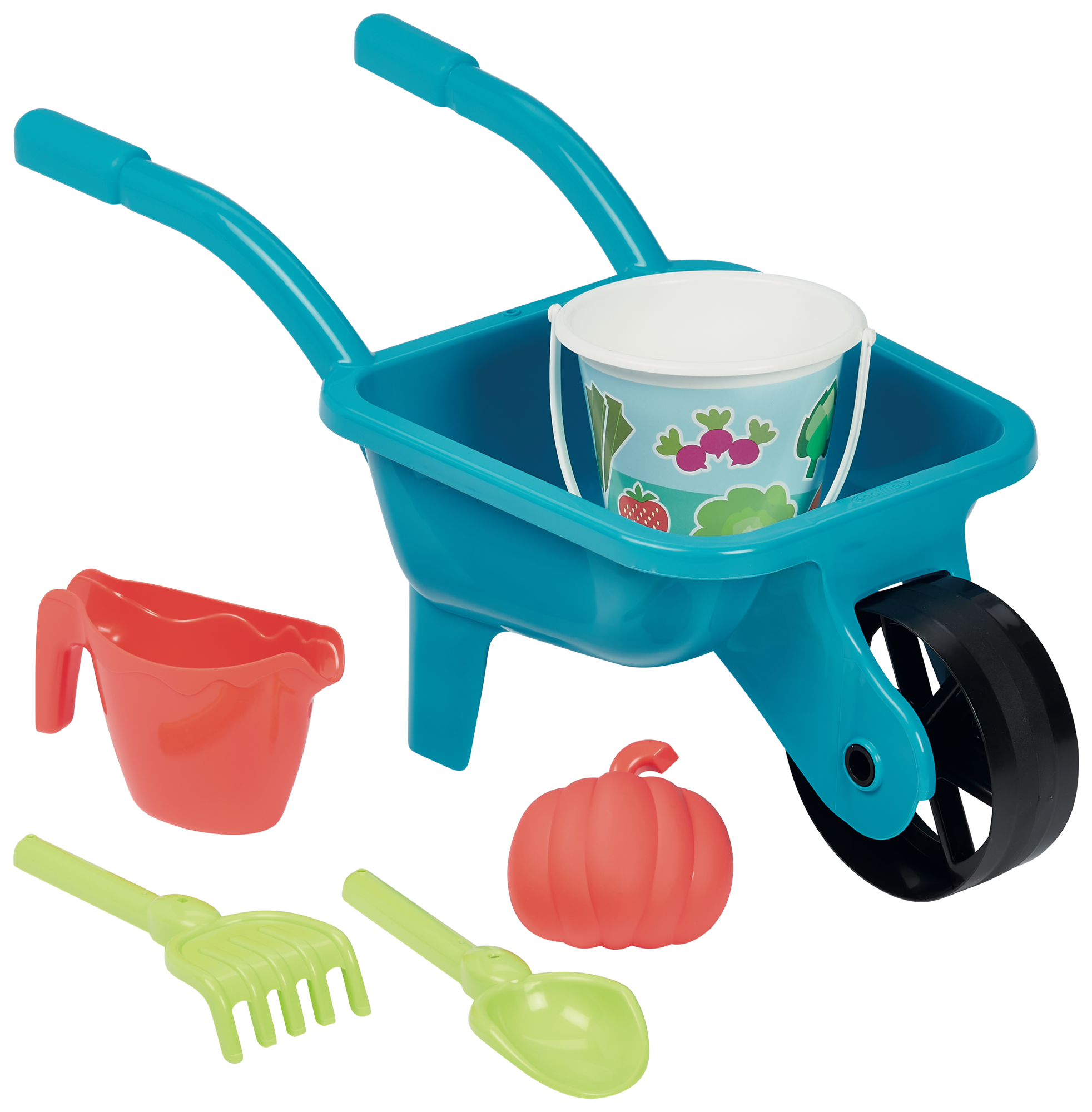 1 brouette avec 1 seau, 1 arrosoir, 1 râteau, 1 pelle et 1 moule.