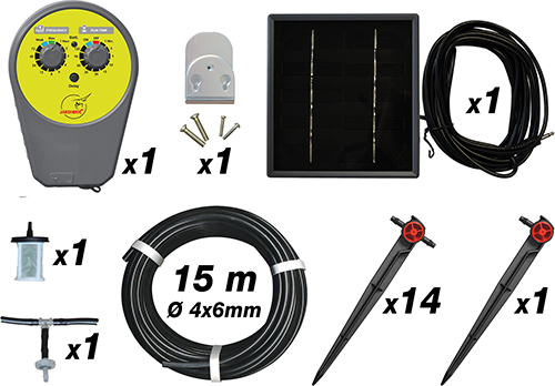 Comprend une pompe, un panneau solaire, 15 m de tuyau Ø 4-6 mm, 14 goutteurs en ligne 4 L/h..