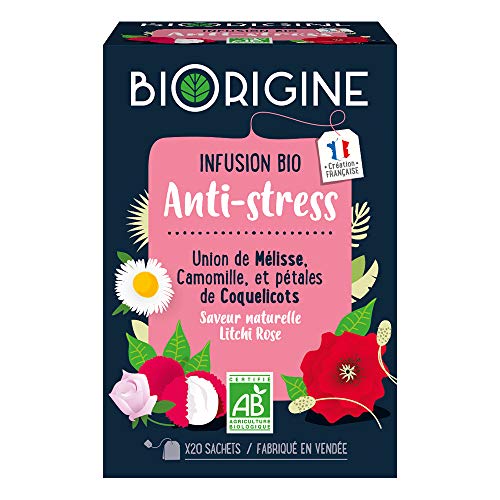 3286010048080 BiOrigine élabore des recettes saines et gourmandes pour se faire plaisir tout en prenant soin de soi : cette infusion Anti-stress est une aide réconfortante pour affronter les tensions du quotidien,L'alliance exquise de la mélisse et du coquelicot aide le corps à relâcher le stress, apaise les sensations d'agitation et d'énervement pour poursuivre la journée plus sereinement,La camomille et le houblon teintent le mélange d'une douce saveur florale tandis que l'arôme naturel de litchi rose ajoute au tout une touche exotique qui ravira votre palais,Préparation : faites chauffer l'eau à 85°C pour préserver les propriétés des plantes et laissez infuser 5 minutes - votre infusion gourmande est prête !,Livraison : une boîte de 20 sachets d'infusion BiOrigine Anti-stress à la mélisse, au coquelicot et aux plantes d'origine naturelle / Fabriqué en France.