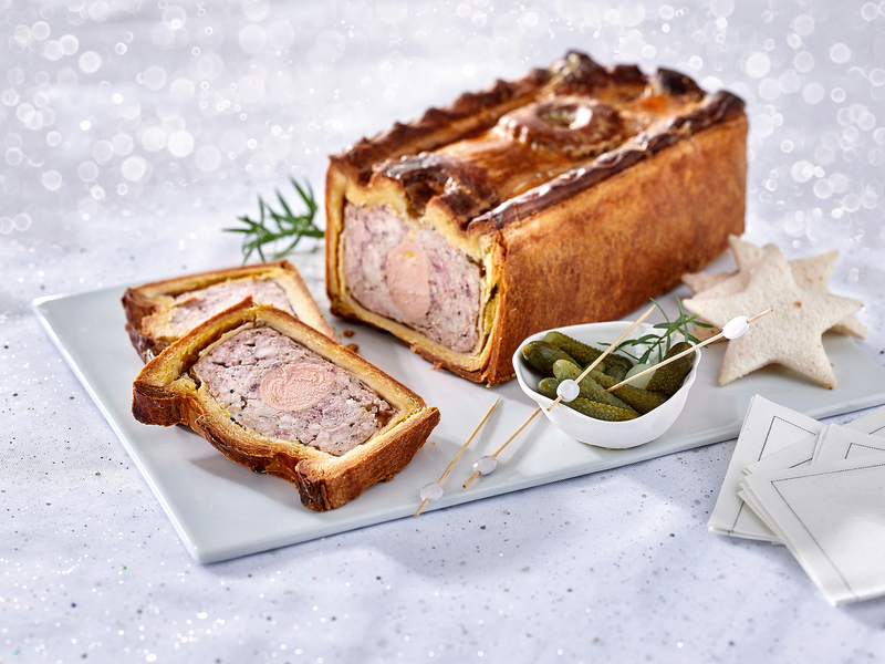 Savourez le délicieux Pâté en Croûte Marbré Volaille Fermière à la Royale, accompagné de ris de veau ou de jambon, imprégné d'épices de Noël. La texture fondante de la mousse au délice de canard ou de chapon se marie parfaitement avec la saveur croquante des pistaches. Disponible du 17 au 24 décembre, cette création gastronomique satisfera les palais les plus exigeants. Ne manquez pas l'occasion de goûter à ce chef-d'œuvre culinaire..