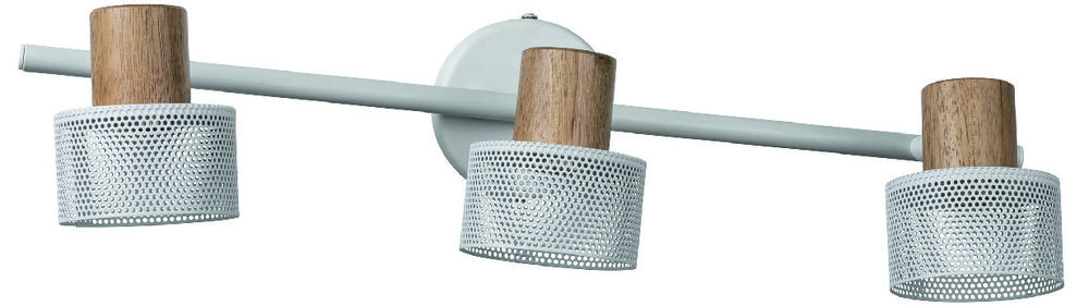 Spot en fer et hévéa. Abat-jour perforé, coloris blanc mat. Dim. : L. 50 x H. 13 x P. 13,5 cm. Fonctionne avec 3 ampoules LED de type GU10 de puissance max.