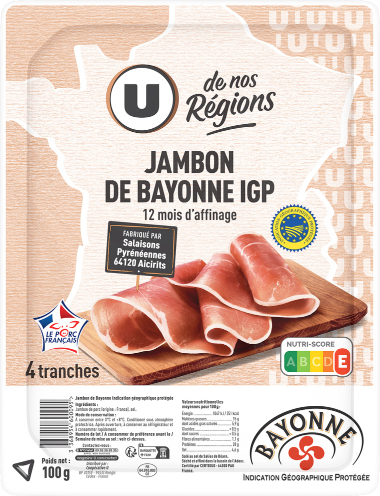 JAMBON DE BAYONNE 12 MOIS D'AFFINAGE U DE NOS REGIONS , identifié par le code barre EAN 3368954600095. Acheter JAMBON DE BAYONNE 12 MOIS D'AFFINAGE U DE NOS REGIONS moins cher en ligne