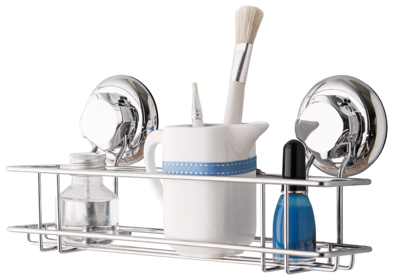 PANIER EN ACIER CHROME, VENTOUSE EN TPU ET ABS Coloris Unique Dim. : 28,5 x 9,4 x H13,7 cm Rack tous usages. 2 ventouses.