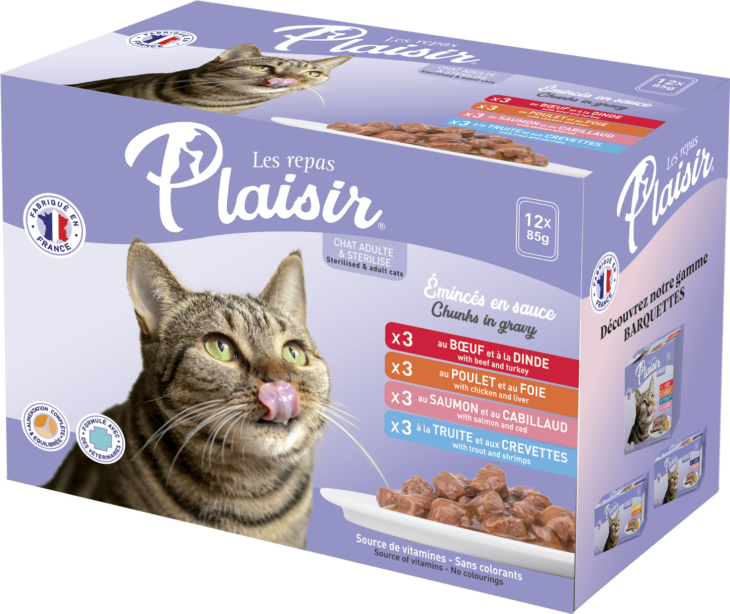 EMINCES EN SAUCE POUR CHAT LES REPAS PLAISIR Le pack de 12 sachets (soit 1,020 g).