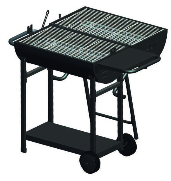 BARBECUE CHARBON DEMI-FÛT DOUBLE - Cuve en acier. 2 grilles de cuisson en acier chromé. Surface de cuisson : L. 36,5 x l. 63,5 cm env., chacune. Dim. : L. 109 x l. 90 x H. 80 cm env. Avec tablette latérale de dim. : L. 27,8 x l. 34 cm.