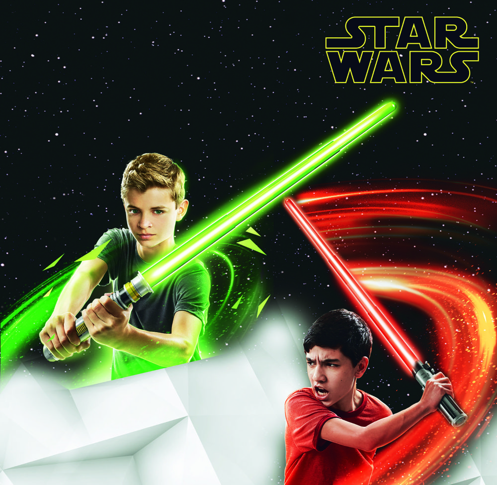 Apprends à combattre avec ton sabre lumineux et sonore qui reproduit les phrases du héros à qui il appartient.