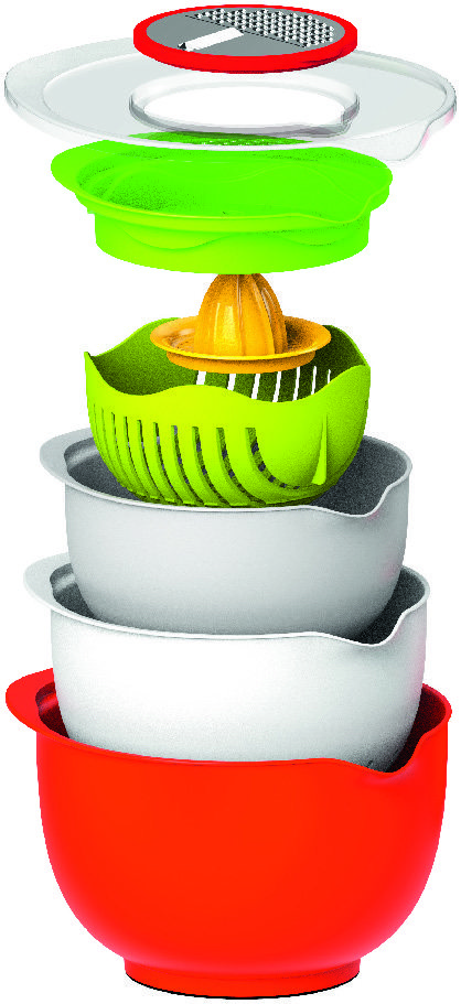 En plastique. Comprend : 2 bols rouge et gris, 1 passoire blanche, 1 coupe salade vert avec son socle, 1 presse agrume, 1 couvercle, 1 râpe..