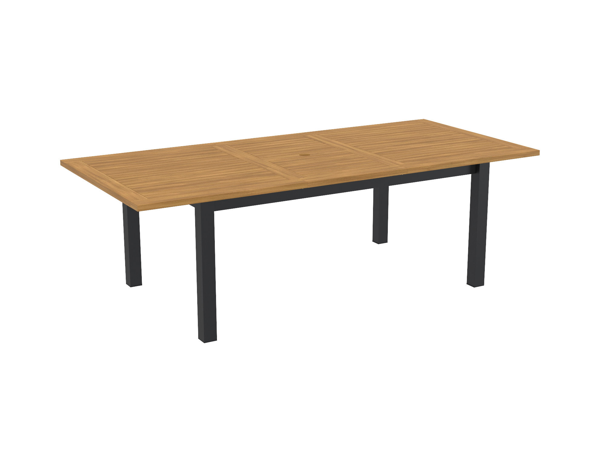 Structure en aluminium et plateau en acacia. Allonge papillon. Dim : L. 180/240 x l. 110 x H. 75 cm..