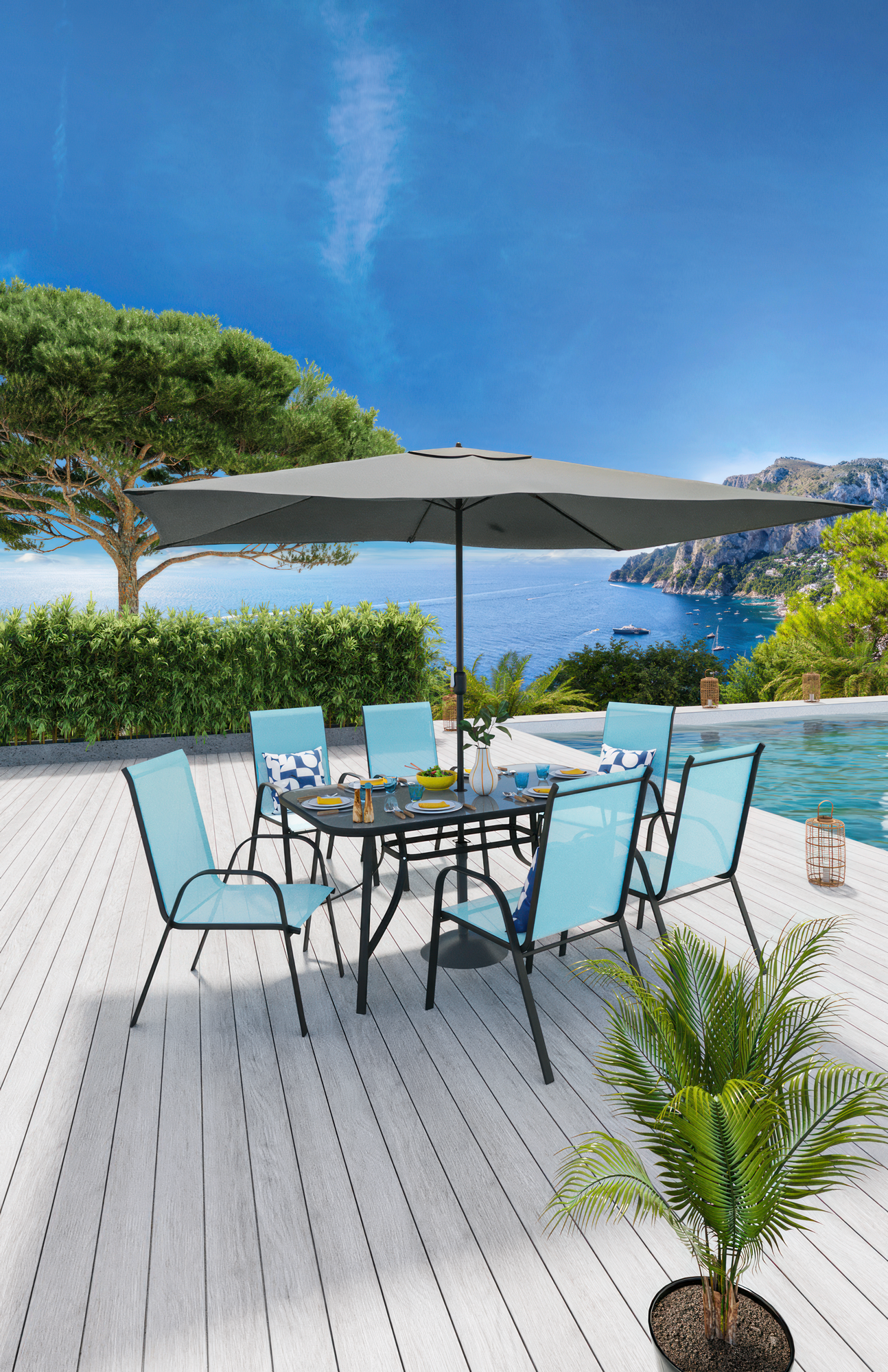 - 1 parasol mât et baleines en acier : dim. : 3 x 2 m, toile en polyester 160 gr/m²..