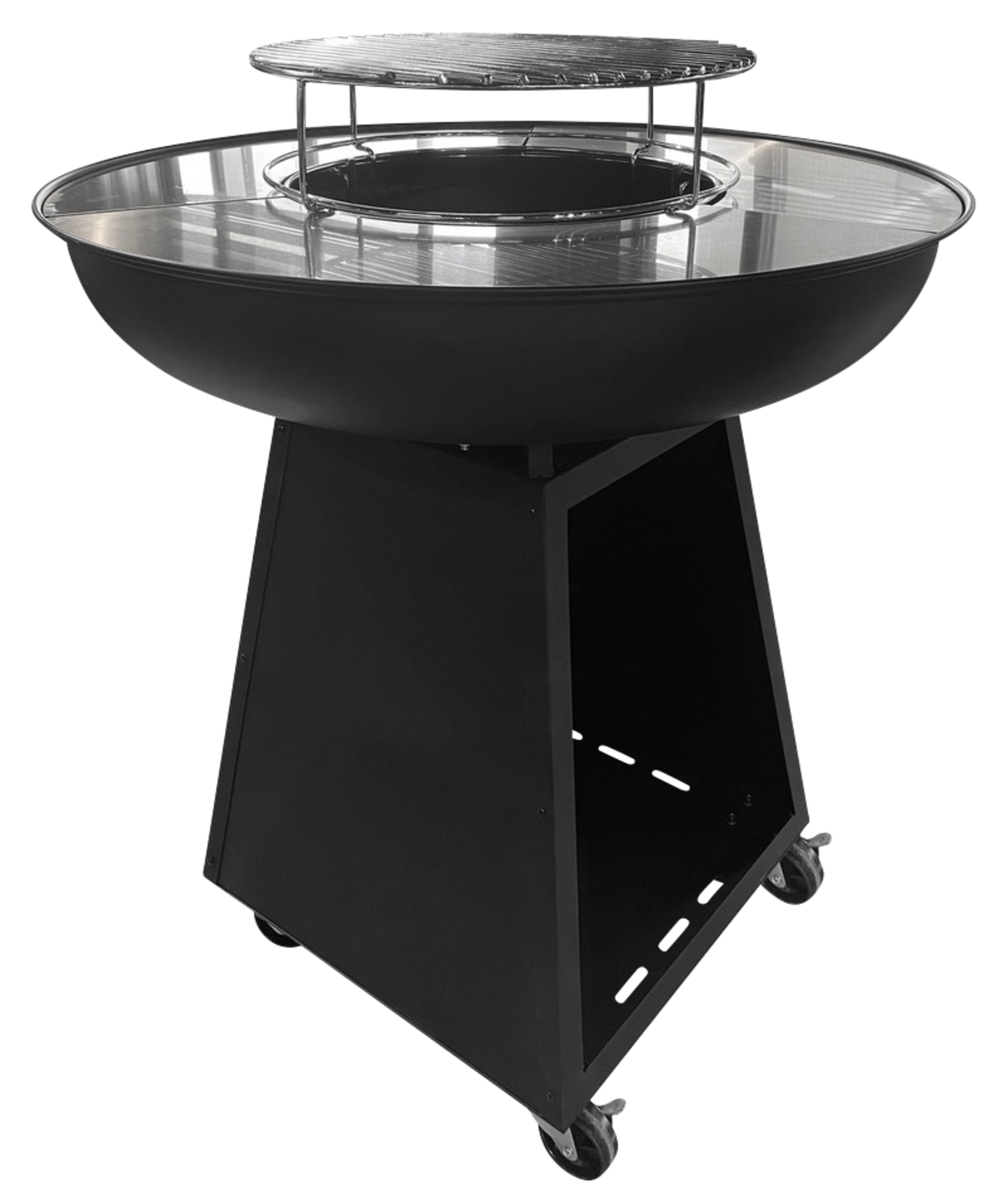 Cuve en acier. Dim. : L. 80 x l. 80 x H. 96cm env. Plaque de cuisson en inox scindée en 3 pièces : D. 78 cm. Grille de cuisson : D. 42,5 cm en acier chromé. Récupérateur de cendres. Hauteur de cuisson : 85 cm. Avec 4 roulettes. Couvercle : 81x 96 cm. Vendu vide..