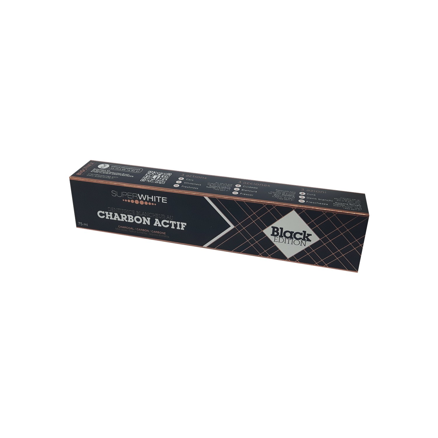 Dentifrice Blancheur au Charbon actif SUPERWHITE - Dentifrice Black Edition : Elu produit de l'année 2019 - Triple action: SOIN, BLANCHEUR et FRAICHEUR - Permet de retrouver la blancheur des dents grâce au pouvoir absorbant du charbon actif - Lutte contre la mauvaise haleine en absorbant les bactéries - Réservé aux enfants et adultes de + 6 ans.