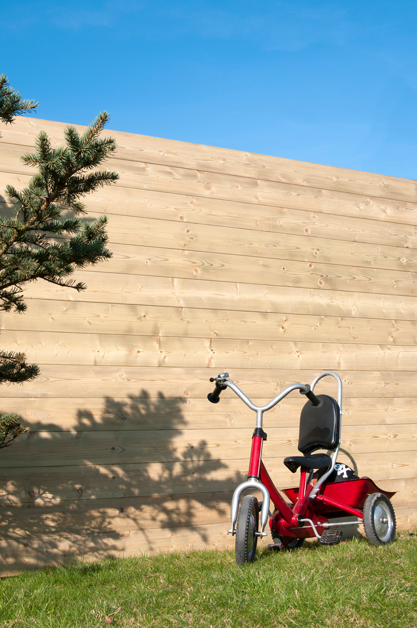 Lame polyvalente rabotée. Dim: L. 2,38 m x l. 140 mm x ép. 18 mm. Vendu en botte de 6 lames (2 m² / botte) lame en sapin du nord. Bois préservé classe III.