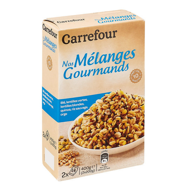 Mélange céréales blé, lentilles, quinoa, riz, orge CARREFOUR les 2 sachets de 200g - Différentes variétés, 400 g. Préparation précuite à base de céréales et de légumineuses. BLÉ dur précuit 65% - lentilles vertes précuites 10% - lentilles blondes décortiquées précuites 10% - quinoa rouge 5% - riz sauvage 5% - flocons d'ORGE 5% - Peut contenir des traces de SOJA..