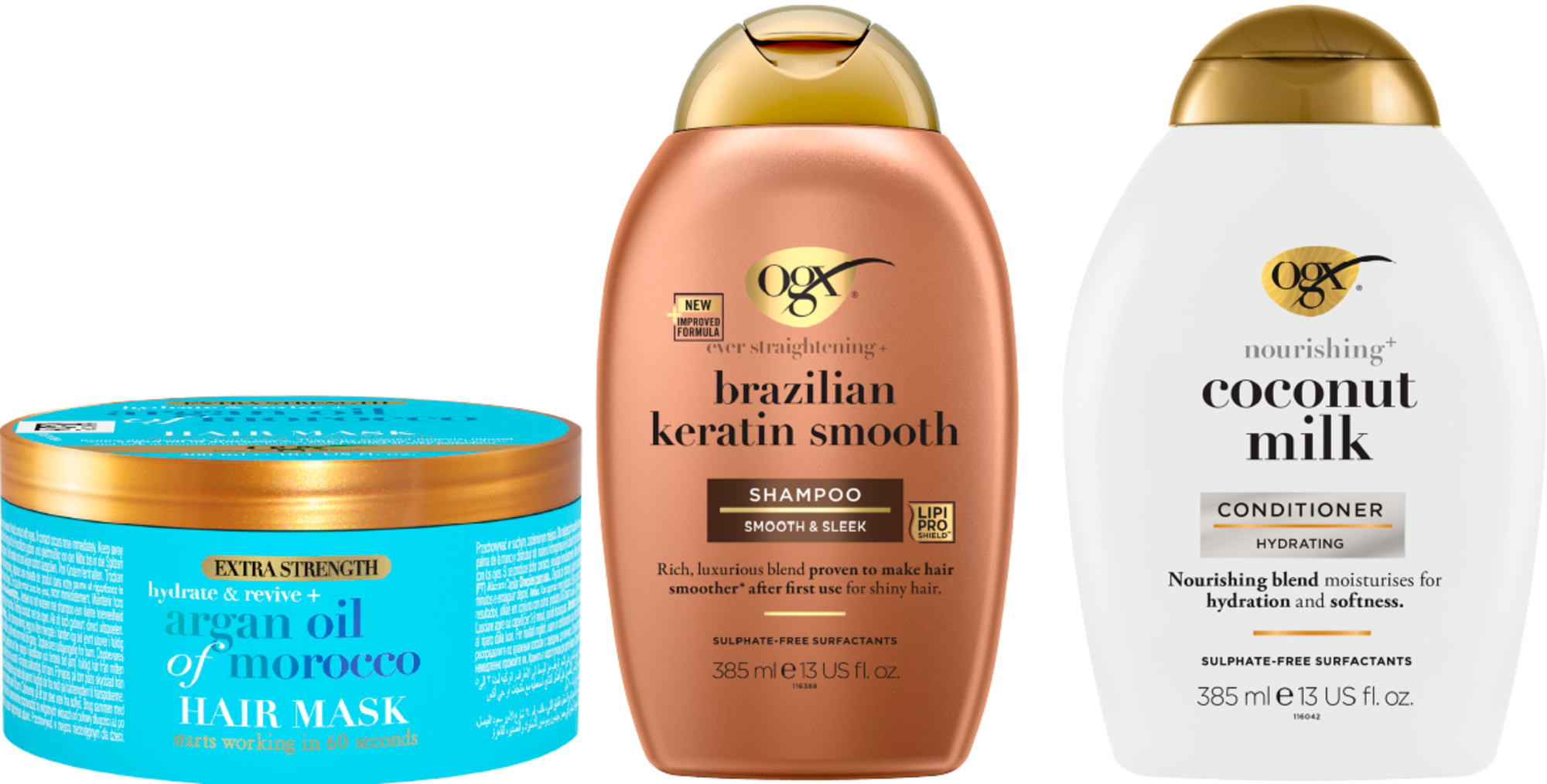 Au choix : Huile d’argan Maroc, Lait de coco ou lissage Brésilien. 385 ml. Le L : 10,86 €. Également disponible en Après-Shampoing ou Masque