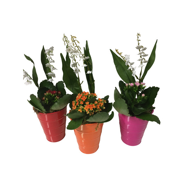 Pot en zinc de couleurs avec une gerbera. I VERT Disponible dans un pot en zinc avec 3/5 brins de muguet avec un rosier à 18,99 €.
