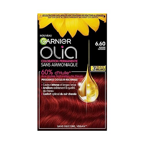 3600541233072 Coloration permanente aux huiles naturelles de fleurs pour un rouge intense et longue tenue, Qualité du cheveu visiblement améliorée et confort optimal du cuir chevelu,Résultats : Pour des cheveux légers, nourris et protégés contre le dessèchement, Multitude de reflets, Couleur intense et uniforme,Conseils d’utilisation : Réaliser un test d’allergie au préalable 48h avant application, Lire attentivement la notice avant toute application, Quantité recommandée : 1 boîte (cheveux mi-longs), 2 boîtes (cheveux longs),Crème veloutée sans coulure et formulée sans ammoniaque pour un parfum floral léger et agréable à l’application, Technologie O.D.S composée à 60% d’huile pour propulser la couleur au cœur du cheveu,Contenu : 1x Boîte de coloration permanente Garnier Olia, Rouge Intense (6.60), Inclus : gants, bouillote, lait révélateur, crème colorante, soin et notice d’utilisation