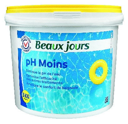 En poudre. Permet de baisser le pH de l’eau de piscine. Optimise l’action des autres traitements. Le pot de 5 kg. Soit le kg au prix de 1,58 €. Existe aussi en pH + au même prix.