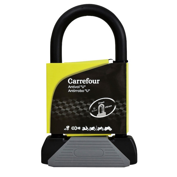 Utilisez la canne antivol voiture carrefour pour sécuriser vos engins - Le bloque volant carrefour protège votre voiture contre le vol - Antivol U, noir et gris, composé d'une anse en acier a cémentation unique. Il se ferme grâce a son système clipsable..