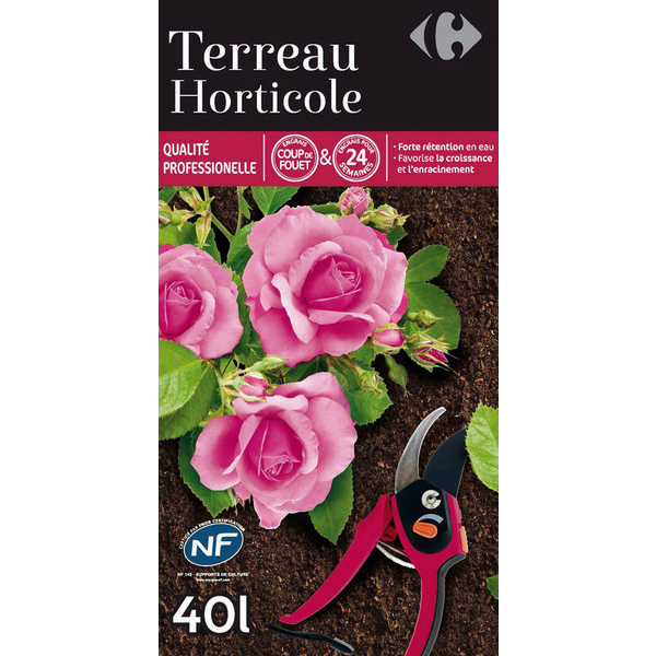 40 L. Qualité professionnelle. Contient une double fertilisation avec un engrais à effet immédiat pour assurer le bon démarrage de la plante et un engrais longue durée (6 mois). Bonne rétention en eau. Support de culture NF U 44-551. .