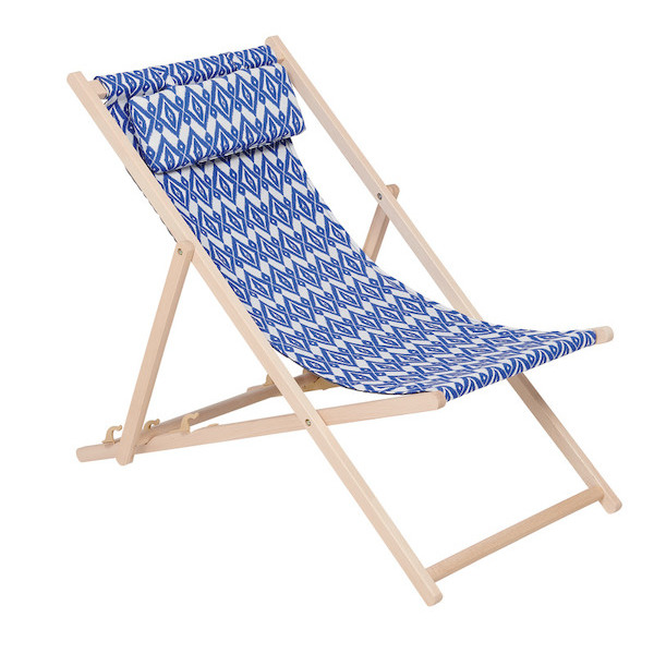 Dim. pliée : l 50 x H 116 cm. 50 % coton, 42 % polyester, 5 % viscose et 3 % autres fibres Structure en hêtre. Housse amovible, déperlante et lavable. Repose tête 3 positions. Différents décors et coloris.